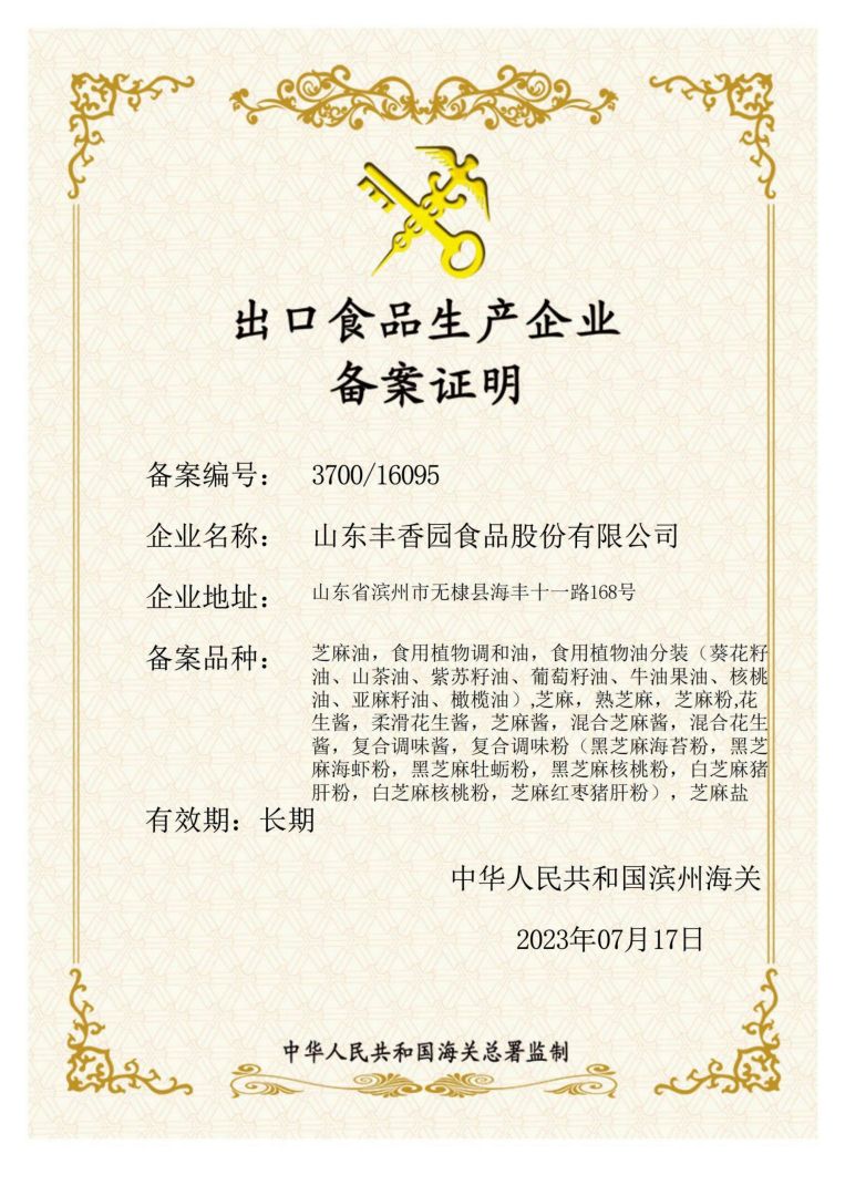 山東豐香園食品股份有限公司位于山東省濱州市無棣縣海豐十一路168號,公司擁有員工50多人,年銷售收入6000多萬元,是華北地區最大的純正芝麻香油、芝麻食品定制代加工生產、出口基地。 ? ? 豐香園小磨香油、芝麻調和油、花生醬、芝麻醬、混合醬、熟芝麻制品均已通過英國零售商協會BRC認證、歐盟 美國和國內有機、HACCP體系認證,是山東省出口食品備案企業。 ? ? 豐香園小磨香油、芝麻香油、芝麻醬以傳統石磨工藝精制而成,從原料進庫到成品出廠,經過12道工序嚴格檢測,確保了產品符合國家標準和出口標準,讓廣大消費者吃的放心,吃的營養,吃的健康,豐香園公司致力于打造中國純正芝麻香油、芝麻醬領導品牌。? ? 在歷史和未來之間,“豐香園”一直是純真香油的誠信領導者,豐香園芝麻食品公司用良心磨油,拒絕摻假,每一滴芝麻油都是純正的,被廣大消費者頌有“無棣特產黃金油”,“魯北瓊漿”的美譽。 ? ? 作為中國一家專業生產小磨芝麻香油、芝麻醬的現代化企業,豐香園芝麻香油秉承“真色、真味、真香”的三真級行業新標準,始終走在行業標準的前列。從芝麻采購、驗收檢測、生產、包裝、銷售,一體化產業鏈,真正做到無污染。? ? 豐香園芝麻食品定制代加工產品,已覆蓋山東、兩廣、京津唐、東北及華南地區,出口到日本、韓國、及東南亞等國家和地區。